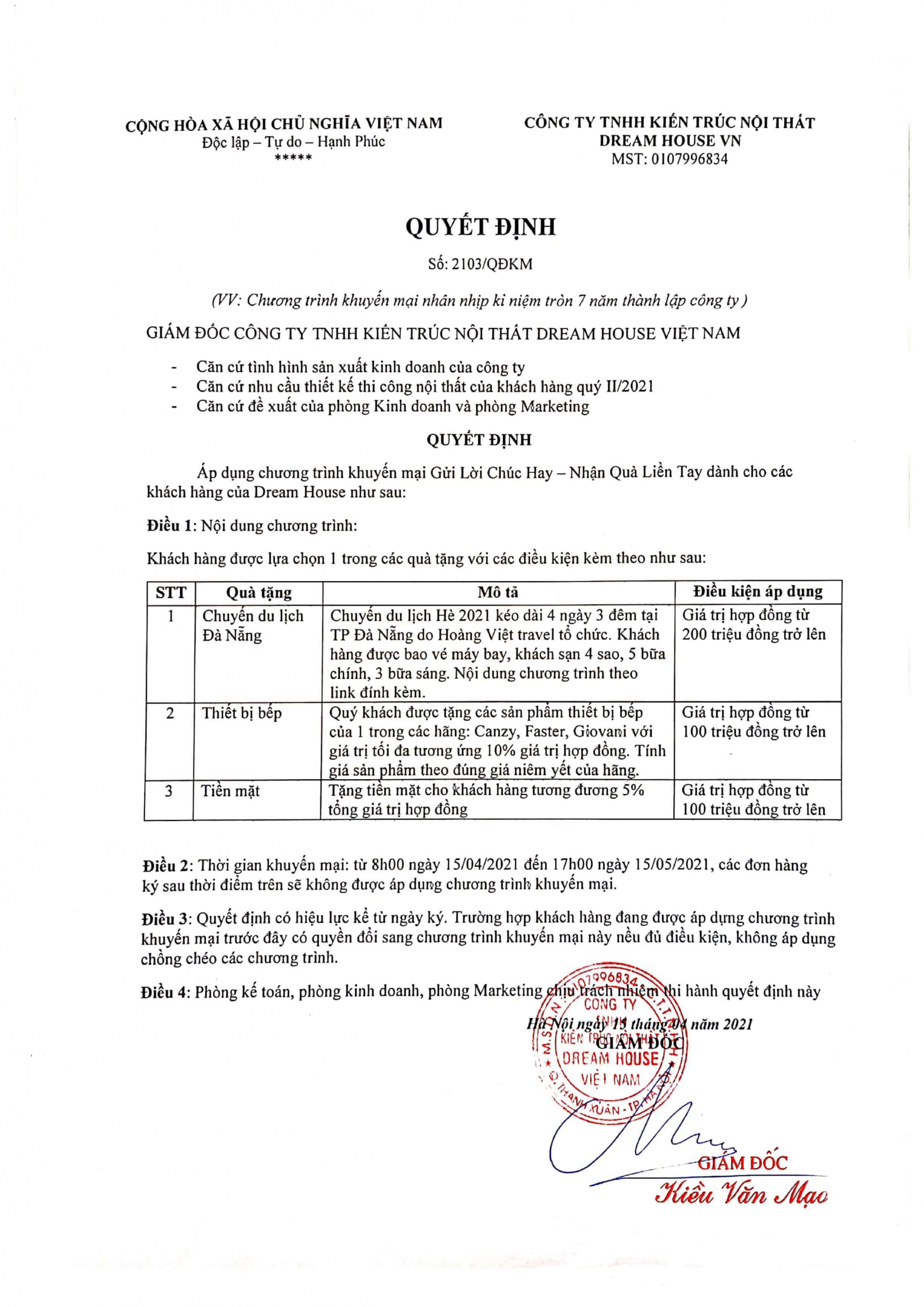 CTKM áp dụng đối với khách hàng kí hợp đồng thi công từ ngày 15/04/2021 đến ngày 15/05/2021. Bạn còn chờ gì nữa mà không gian sự kiện hấp dẫn này của Dream House ngay hôm nay.