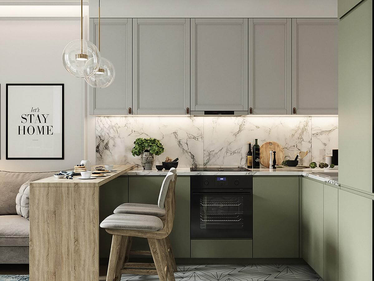 Thiết kế tủ bếp gỗ kết hợp với tone mà xanh cốm